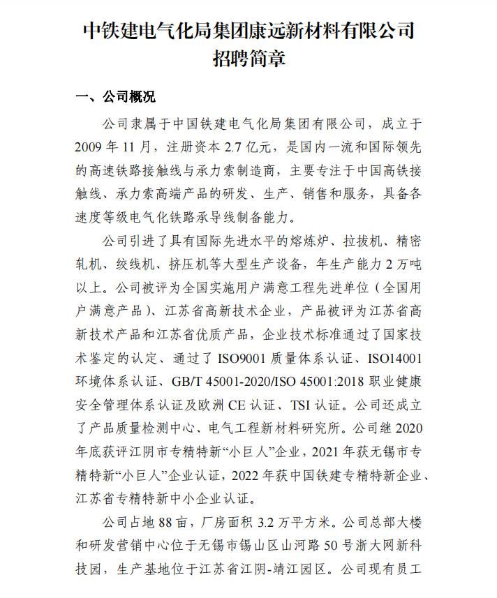 招聘单位:中铁建电气化局集团康远新材料有限公司